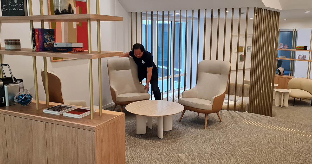 Mark, le chef d’équipe, nous accompagne tout au long de notre visite. Il travaille chez ESSI Opale depuis 4 ans. Il travaille actuellement sur plusieurs sites en parallèle, mais reprendra à terme l’Immeuble Rio. « Je travaille maintenant ici car c’est un nouveau chantier. Il y a beaucoup d’enjeux sur le poste. On essaye de rattraper au fur et à mesure, pour toujours faire mieux, regarder l’organisation, les produits… » Une grande équipe à manager, mais ça ne fait pas peur à Mark : « C’est une grande responsabilité de reprendre un site, de former les équipes, ça me plaît, j’aime beaucoup le challenge. Maria, ma responsable, me donne la confiance pour faire les choses bien. »